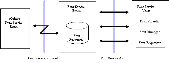 A font service entity manages a set of font resources. Any information retrieval and/or modification on one of those font resources shall be done by this entity. In the case that a font service user sends a font query to a font service entity to get some information from a font resource which is not directly managed by the font service entity, the entity may send a font query to get the information from another font service entity. In such a case, a font service entity itself may act as a font service user to another font service entity.