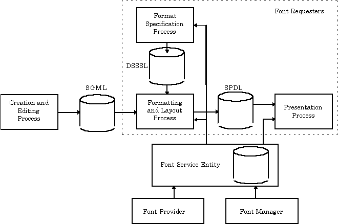The font resource information requested by these processes is different process by process. Formatting and Layout Process requests the description and metrics information. Presentation Process requests all the font resource information (description information, metrics information, and glyph shape information).