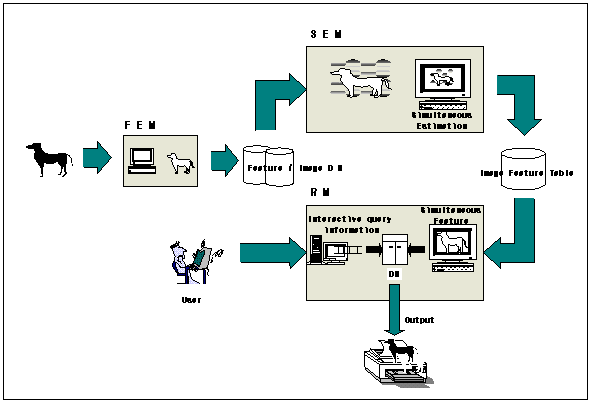 Estimation Module), RM(Retrieval Module) and etc. FEM analyzes automatically various features like color, texture, shape
